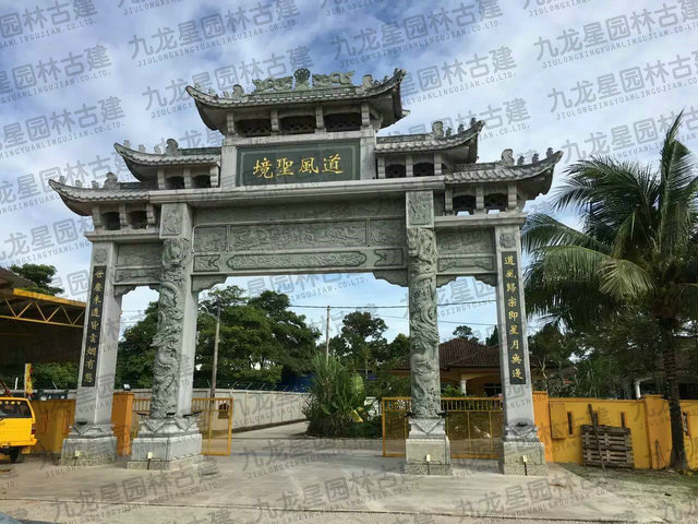 牌坊集中了中國(guó)古建筑最有特征的構(gòu)件組成,有臺(tái)座、柱身(包括夾桿石)、梁坊、樓匾、斗拱、樓頂?shù)葮?gòu)件。石造牌坊材質(zhì)堅(jiān)固敦實(shí)牢靠,且可仿照木結(jié)構(gòu)造型。在藝術(shù)處理上,可以在夾桿石、柱子、額坊等處,雕刻各式各樣的花鳥(niǎo)、圖案、龍鳳及各種瑞獸等等,將中國(guó)傳統(tǒng)的石刻藝術(shù)集中于一身表現(xiàn)出來(lái)。中國(guó)民俗專(zhuān)家講:“石雕不開(kāi)光是石雕工藝品,開(kāi)光后就是具有靈氣的風(fēng)水神器。”所以“非寧?kù)o無(wú)以致遠(yuǎn),非精誠(chéng)無(wú)以神明。” 石牌坊是用石修建的牌坊,是一種裝飾建筑物。柱石的上方刻有麒麟、獅子,夾柱石的浮雕有雙獅戲彩珠,牌坊上還雕刻著其他怪獸云紋。兩側(cè)基石柱各有撐鼓,石柱兩側(cè)配有石獅。牌坊運(yùn)用浮雕、透雕等手法,是我國(guó)建筑藝術(shù)的一大特色。
