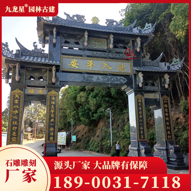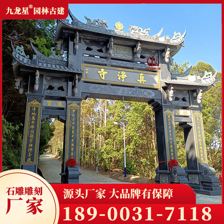 寺廟石牌坊的造型豐富多樣,有單間式、雙間式、多間式等多種形式。其中,單間式石牌坊簡潔明了,適合用于小型寺廟;雙間式石牌坊則莊重大氣,適用于大型寺廟;多間式石牌坊則更加復雜精致,通常是作為主殿前的重要建筑。此外,寺廟石牌坊的造型還受到地域文化的影響,如福建的漳州南山寺石牌坊、浙江的普陀山南海觀音禪寺石牌坊等,都具有鮮明的地方特色。